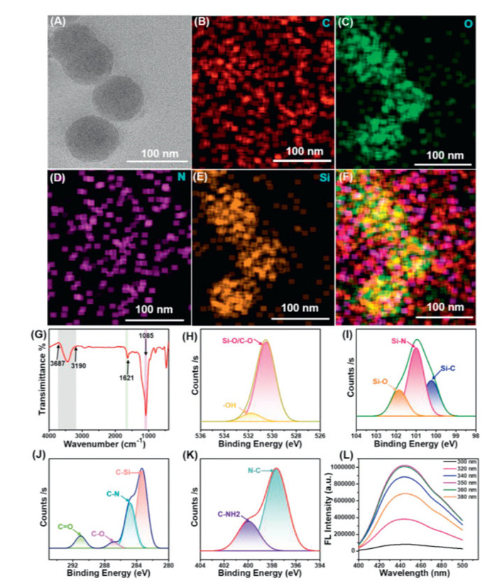 | Fig. 1. Physicochemical properties analysis of CDs@ONs. (A) The TEM image of CDs@ONs. (B–F) The elemental mapping of CDs@ONs. (G) The FT-IR spectrum of CDs@ONs. (H) The O 1s spectrum of CDs@ONs. (I) The Si 2p spectrum of CDs@ONs. (J) The C 1s spectrum of CDs@ONs. (K) The N 1s spectrum of CDs@ONs. (L) The fluorescence spectra of CDs@ONs. | |