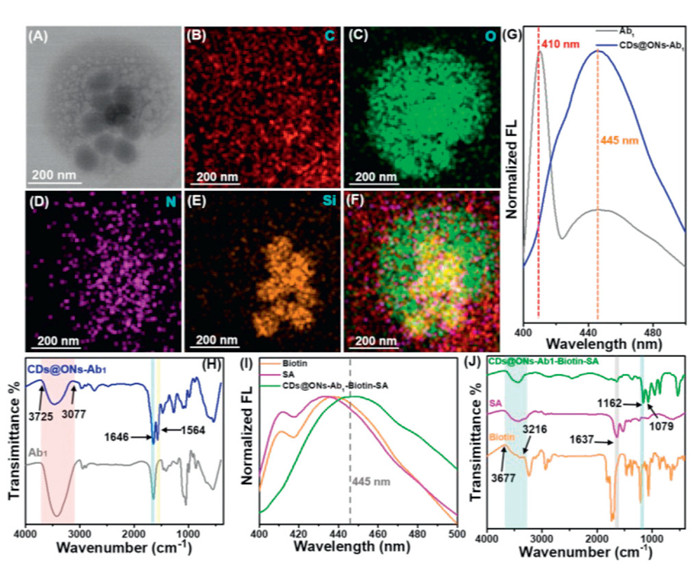 | Fig. 2. Physicochemical properties analysis of CDs@ONs-Ab1 and CDs@ONs-Ab1-biotin-SA. (A) The TEM image of CDs@ONs-Ab1. (B–F) The elemental mapping of CDs@ONs-Ab1. (G) The fluorescence spectra of Ab1, CDs@ONs-Ab1. (H) The FT-IR spectra of Ab1 and CDs@ONs-Ab1. (I) The fluorescence spectra of biotin, SA, and CDs@ONs-Ab1-biotin-SA. (J) The FT-IR spectra of biotin, SA, and CDs@ONs-Ab1-biotin-SA. | |