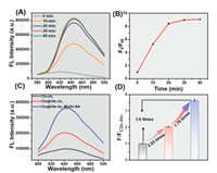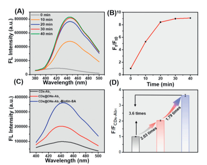 | Fig. 3. Analysis of immunoreaction time and fluorescence signal amplification effect. (A) The fluorescence spectra of CDs@ONs-Ab1-biotin-SA within different immunoreaction times. (B) The fluorescence peak of CDs@ONs-Ab1-biotin-SA vs. immunoreaction time. (C) The fluorescence spectra of CDs-Ab1, CDs@ONs-Ab1, and CDs@ONs-Ab1-biotin-SA for detection 4 ng/mL of GFAP. (D) Comparison of the fluorescence emission peaks of CDs-Ab1, CDs@ONs-Ab1, and CDs@ONs-Ab1-biotin-SA. | |