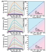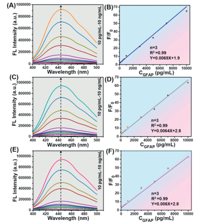 | Fig. 4. Detection of GFAP in PBS, serum, and plasma (rabbit serum and plasma were obtained from the Animal Center of Tianjin Medical Research Institute). (A) Fluorescence emission spectra of immunoprobes incubated with increasing concentrations of GFAP in PBS. (B) The linear fitting plot of F/F0 vs. GFAP concentration (n = 3). (C) Fluorescence emission spectra of immunoprobes, incubated with increasing concentrations of GFAP in serum. (D) The linear fitting plot of F/F0 vs. GFAP concentration (n = 3). (E) Fluorescence emission spectra of immunoprobes, incubated with increasing concentrations of GFAP in plasma. (F) The linear fitting plot of F/F0 vs. GFAP concentration (n = 3). | |