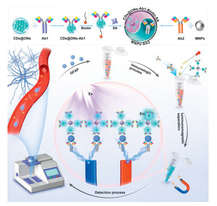 Immunomagnetic nanoparticles have been widely used in the construction of biosensors due to their ability to selectively recognize targets in complex samples, eliminating the need for complicated pre-processing procedures. In this study, we developed a photomagnetic interacting fluorescence immunoassay system for ultrasensitive and specific analysis of GFAP. As illustrated in Scheme 1, SA-biotin-modified immunocapsules (CDs@ONs-Ab1-biotin-SA) and immunomagnetic nanoparticles (MNPs-Ab2) were utilized as fluorescent and magnetic probes, respectively. These probes could specifically recognize and capture GFAP in complex samples, forming a sandwich immuno-couple with GFAP. Following immunomagnetic separation treatment, the fluorescence immunoassay system exhibited distinct optical responses to different concentrations of GFAP, leveraging the high fluorescence sensing ability of CDs@ONs. Notably, the fluorescence immunoassay system demonstrated low background interference, vigorous signal intensity, exceptional specificity, and high sensitivity, which enabled accurate quantitative analysis of GFAP content in blood samples. Therefore, this method shows promise for rapid clinical assessment and diagnosis of TBI.