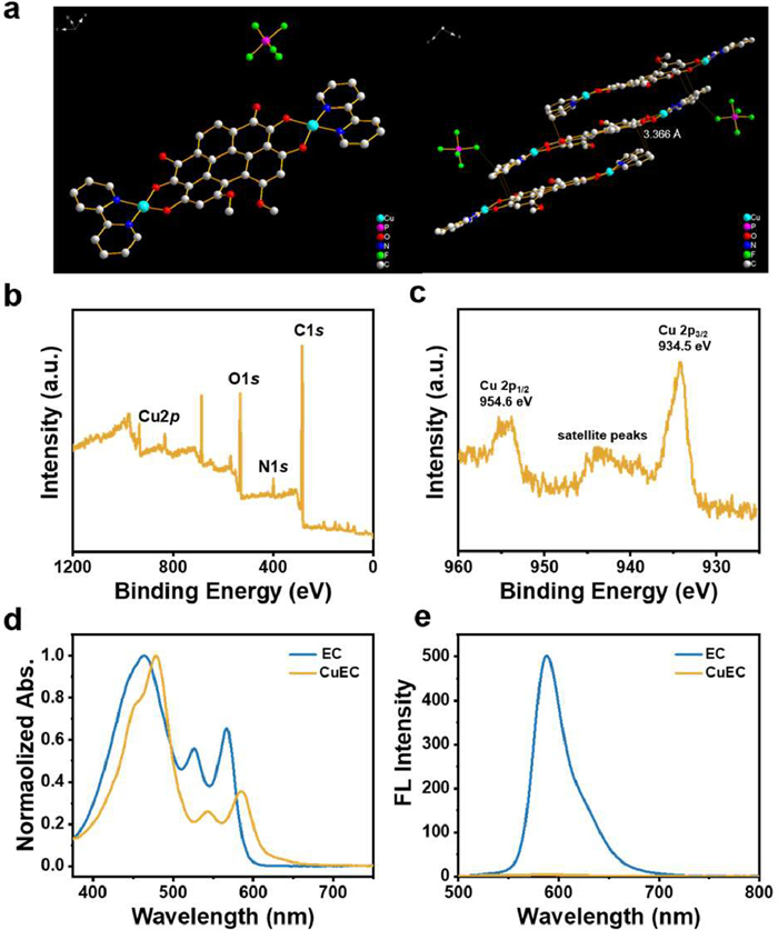 | Fig. 1. (a) Crystal structure and molecular packing of CuEC (hydrogen atom is omitted for clarity). (b) XPS survey spectra of CuEC. (c) Cu 2p XPS spectra of CuEC. (d) Normalized ultraviolet–visible (UV–vis) absorbance spectra of EC and CuEC in DMSO. (e) Fluorescence spectra of EC and CuEC (10 µmol/L, DMSO, λex = 480 nm). | |
