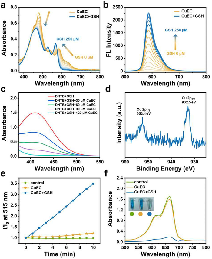| Fig. 2. (a) The absorbance spectra and (b) fluorescence spectra of CuEC (20 µmol/L, DMSO, λex = 480 nm) upon treatment with different concentrations GSH at room temperature. (c) GSH consumption ability with DTNB as an indicator. (d) Cu 2p XPS spectra of CuEC + GSH. •OH detection using (e) HPF (5 µmol/L, phosphate-buffered saline) and (f) MB as indicators. | |