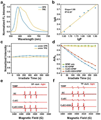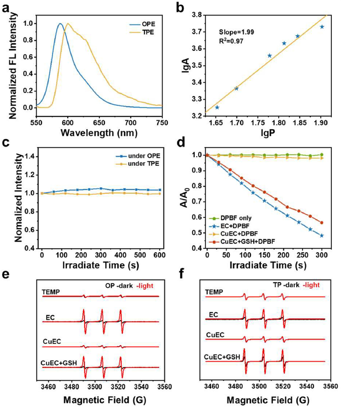 | Fig. 3. (a) OPE (10 µmol/L) and TPE (1 mmol/L) fluorescence spectra of EC in DMSO at room temperature. (b) Quadratic correlation between the intensity of TP fluorescence and laser power. (c) Photostability of EC under two different laser conditions: 488 nm laser and 1000 nm fs laser. (d) 1O2 detection using DPBF as an indicator under 532 nm laser irradiation. ESR spectra of 1O2 with TEMP as a spin trapping reagent under (e) 532 nm laser irradiation and (f) NIR-Ⅱ 1000 nm fs laser irradiation (100 mW/cm2). | |