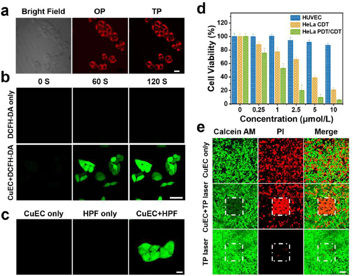 | Fig. 4. (a) Fluorescent images of HeLa cells incubated with CuEC (5 µmol/L) under OP (488 nm) and TP (1000 nm) excitation. Scale bar: 20 µm. (b) Intracellular generation of ROS using DCFH-DA (5 µmol/L) as probe under 1000 nm fs laser irradiation. Scale bar: 20 µm. (c) Intracellular generation of •OH using HPF (5 µmol/L) as probe. Scale bar: 20 µm. (d) MTT assay of HUVEC and HeLa cells. (e) Calcein AM/PI co-staining analysis of HeLa cells. Scale bar: 100 µm. | |