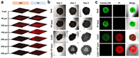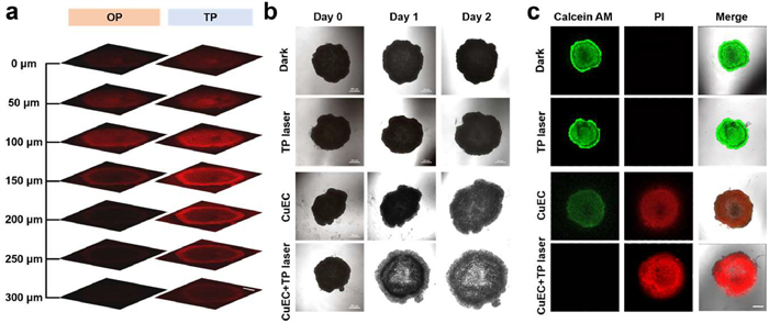 | Fig. 5. (a) Fluorescent images of HeLa MCTS incubated with CuEC (5 µmol/L) under OP (488 nm) and TP (1000 nm) excitation. Scale bar: 300 µm. (b) Inhibition of tumor cells growth in HeLa MCTSs. Scale bar: 500 µm. (c) Calcein AM/PI co-staining analysis of HeLa MCTSs. Scale bar: 500 µm. | |