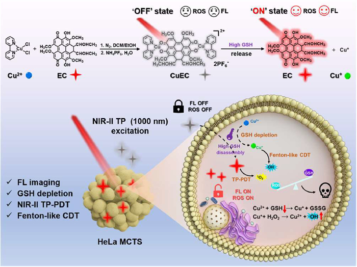 Elsinochrome is a type of natural perylenequinonoid PS with advantages such as high singlet oxygen (1O2) quantum yield (as high as 0.98, with hypocrellin B (0.84) in benzene as a reference [39]), low toxicity, and fast metabolism in vivo [40,41]. The presence of a large conjugated π-electron system in elsinochrome enables it to exhibit significant TP absorbance, making it well-suited for TP-PDT [42,43]. Additionally, the structure of elsinochrome C (EC) contains phenolic hydroxyl and quinonoid carbonyl oxygens, which serve as binding sites for Cu2+ chelation [44]. Herein, we developed a novel GSH-activatable prodrug, named CuEC, for the combination NIR-Ⅱ TP-PDT/CDT therapy (Scheme 1). The CuEC can be activated to an “ON” state by overexpressed GSH in the TME, resulting in the release of EC and Cu+. The released EC can fluoresce for FL imaging and generate 1O2 for TP-PDT under NIR-Ⅱ TP laser irradiation. Additionally, the released Cu+ can react with overexpressed H2O2 through a Fenton-like reaction, generating toxic •OH. This process depletes GSH and reduces the tumor’s antioxidant activity, thereby enhancing the effectiveness of combination therapy. In vitro experiments have demonstrated that CuEC achieves significant tumor cell ablation in both 2D monolayer cells and 3D multicellular tumor sphere (MCTS) through the combination of NIR-Ⅱ TP-PDT and CDT. This offers a promising approach for designing activatable PSs and treating deep-seated tumors.