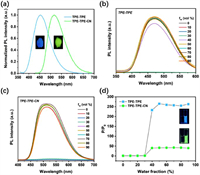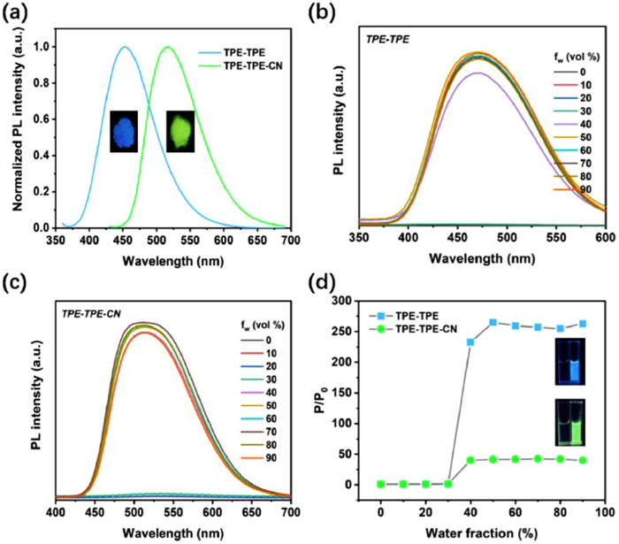 | Fig. 1. (a) Solid fluorescent spectra of TPE-TPE and TPE-TPE-CN, excitation wavelength: TPE-TPE 350 nm, TPE-TPE-CN 420 nm. Inset: optical pictures of TPE-TPE and TPE-TPE-CN in solid state under UV light at 365 nm, from left to right. PL spectra of (b) TPE-TPE and (c) TPE-TPE-CN in DMF/water mixture with different water fractions (fw, 0–90%). (d) PL intensity changes at a maximum emission wavelength of TPE-TPE and TPE-TPE-CN in different water fractions of DMF/water solution. Concentration: 20 µmol/L. Excitation wavelength: TPE-TPE 310 nm, TPE-TPE-CN 365 nm. Inset (from top to bottom): optical pictures of TPE-TPE and TPE-TPE-CN in pure DMF (left) and in DMF/water solution with 90% water fraction (right) under UV light at 365 nm. P0 and P are the PL intensity at λem of TPE-TPE and TPE-TPE-CN in pure DMF and DMF/water solutions, respectively. | |