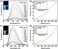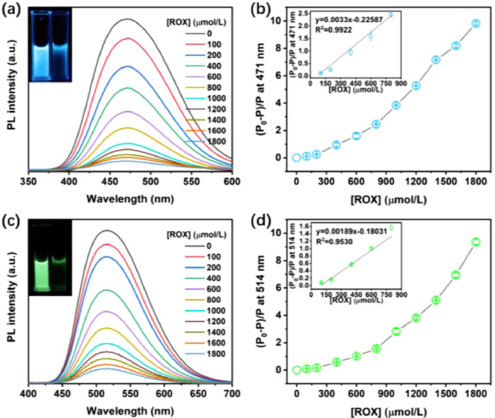 | Fig. 2. PL spectrum change and a titration curve of (a, b) TPE-TPE and (c, d) TPE-TPE-CN towards ROX with different concentrations (0–1800 µmol/L) in 90% water/DMF solution. P0 and P are the PL intensity of the probes at λem before and after addition of ROX with different concentrations in 90% water/DMF solution. Concentration: 20 µmol/L. Excitation wavelength: TPE-TPE 310 nm, TPE-TPE-CN 365 nm. Inset: optical pictures of TPE-TPE and TPE-TPE-CN before and after the addition of 1800 µmol/L of ROX under UV light at 365 nm, from left to right. Data are presented as mean ± standard deviation (SD) (n = 3). | |
