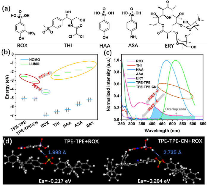 | Fig. 4. The possible detection mechanism of TPE-TPE and TPE-TPE-CN for organic arsenic. (a) Structure of pollutants. (b) HOMO and LUMO energies of TPE-TPE, TPE-TPE-CN, and pollutants obtained by DFT calculation. (c) Overlap of adsorption spectra of pollutants and PL spectra of the probes in 90% water/DMF. (d) Adsorption energy of the probes-ROX system from DFT calculation, from left to right: TPE-TPE+ROX and TPE-TPE-CN+ROX. The white, gray, red, purple, and blue balls represent hydrogen, carbon, oxygen, arsenic, and nitrogen atoms, respectively. Concentration: 20 µmol/L. Excitation wavelength: TPE-TPE 310 nm, TPE-TPE-CN 365 nm. | |