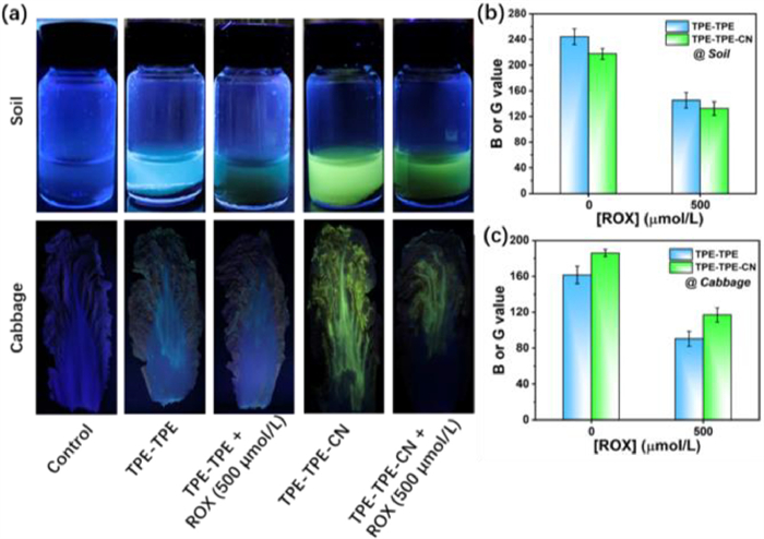 | Fig. 5. Applications of the probes for ROX detection in soil and cabbage. (a) Fluorescent photos and (b, c) corresponding B or G value changes obtained in a color discriminator of TPE-TPE and TPE-TPE-CN in the absence and presence of ROX (500 µmol/L) in 90% water/DMF solution (top) and cabbage (bottom). Concentration of the probes: 10 µmol/L. Data are presented as mean ± SD (n = 3). | |