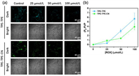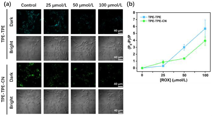 | Fig. 6. Application of TPE-TPE and TPE-TPE-CN for ROX detection in living cells. (a) Confocal fluorescent images of TPE-TPE and TPE-TPE-CN (from top to bottom) in the absence and presence of ROX with different concentrations (control, 25–100 µmol/L, from left to right) in living 3T3 cells. (b) PL intensity changes of TPE-TPE and TPE-TPE-CN in the presence of different ROX in living 3T3 cells. P0 and P are PL intensity at λem of the probes in the absence and presence of ROX in 3T3 cells. The concentration of the probes: 10 µmol/L, excitation wavelength: 404 nm. Scale bar: 40 µm. Data are presented as mean ± SD (n = 3). | |
