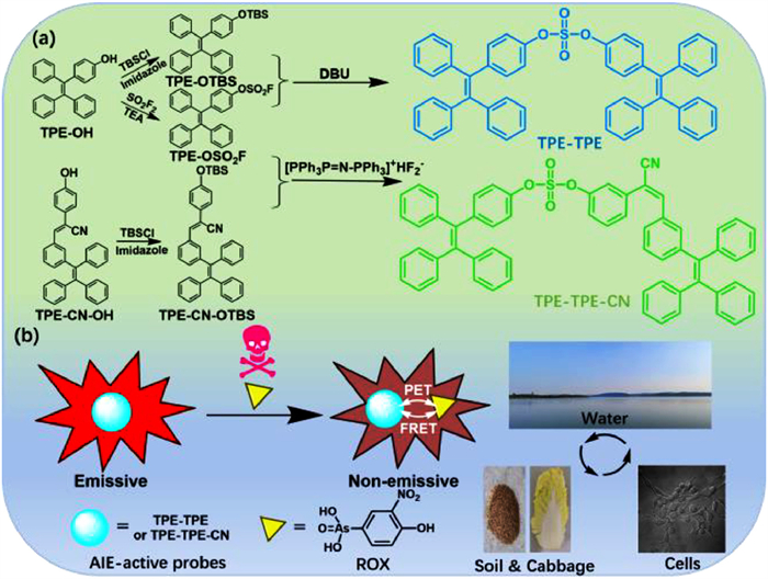 In summary, two TPE-based derivatives with typical AIE characteristics both in their solid and aggregated state were successfully fabricated via the SuFEx reaction. These two fluorescent probes can be used to selectively detect low concentrations of organic arsenic in water on account of the PET and FRET effect between the probes and pollutants. Moreover, these two probes exhibit superior detection performance for organic arsenic both in real environments and living cells. Our study provides a new strategy for the development of AIE-active probes for monitoring organic pollutants with low concentrations in the environment and living cells.