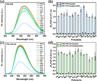 | Fig. 3. Selectivity and anti-interference behaviors of TPE-TPE and TPE-TPE-CN towards ROX and other pollutants. PL spectrum changes and PL intensity changes at λem of the fluorescent probes for different pollutants with a concentration of 600 µmol/L in 90% water/DMF solution. P0 and P are the PL intensity of the probes at λem in the absence and presence of pollutants in 90% water/DMF solution. (a, b) TPE-TPE, (c, d) TPE-TPE-CN. Concentration: 20 µmol/L. Excitation wavelength: TPE-TPE 310 nm, TPE-TPE-CN 365 nm. Data are presented as mean ± SD (n = 3). | |
