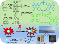 | Scheme 1. (a) Synthetic routine of TPE-TPE and TPE-TPE-CN. (b) TPE-TPE and TPE-TPE-CN for multidimensional detection of ROX in water, soil, cabbage, and living cells. | |