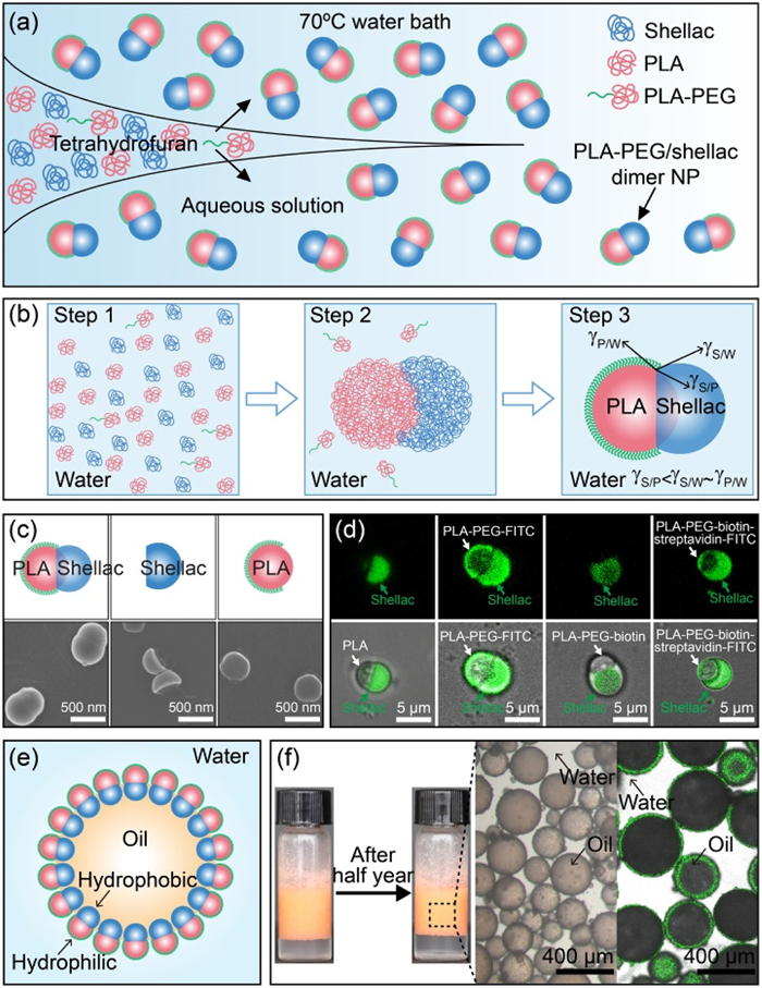 | Fig. 1. One-step preparation of biocompatible amphiphilic dimer NPs with tunable particle morphology and surface property. (a) Schematic illustration showing the formation of amphiphilic PLA-PEG/shellac dimer NPs upon rapid solvent exchange and controlled co-precipitation. (b) Self-assembly of PLA-PEG/shellac dimer NPs. (c) SEM images of PLA-PEG/shellac dimer NPs (left), crescent moon-like shellac bulbs (middle) and aspherical PLA bulbs (right). (d) Fluorescent and overlay images of PLA-PEG/shellac, PLA-PEG-FITC/shellac, PLA-PEG-biotin/shellac and PLA-PEG-biotin-streptavidin-FITC/shellac dimer NPs. (e) Model of an NP-stabilized oil droplet. (f) Photographs and optical microscope images of oil-in-water emulsions stabilized by amphiphilic PLA-PEG/shellac dimer NPs. If not specified, dimer NPs are prepared using 10 mg/mL shellac and 10 mg/mL PLA with 2.5% PLA-PEG. The volume ratio of water to oil is 1 to 1. | |