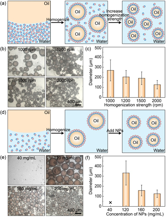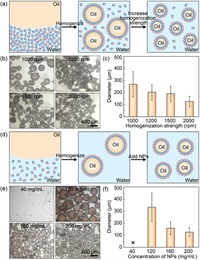 | Fig. 4. Dependances of emulsion size on homogenization strength and particle concentration. (a) Schematics showing the emulsification of oil-in-water emulsions in the presence of excess colloidal surfactants. The emulsion size decreases as the homogenization strength increases. (b) Optical microscope images and (c) diameters of NP-stabilized oil-in-water emulsions prepared by different homogenization strengths. The concentration of amphiphilic dimer NPs is kept constant at 160 mg/mL. (d) Schematics showing the emulsification of oil-in-water emulsions in the presence of insufficient colloidal surfactants. The emulsion size decreases as the NP concentration increases. (e) Optical microscope images and (f) diameters of NP-stabilized oil-in-water emulsions prepared with different NP concentrations. The homogenization strength is kept constant at 2000 rpm. Data are presented as mean ± standard deviation (SD) (n = 60). | |