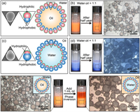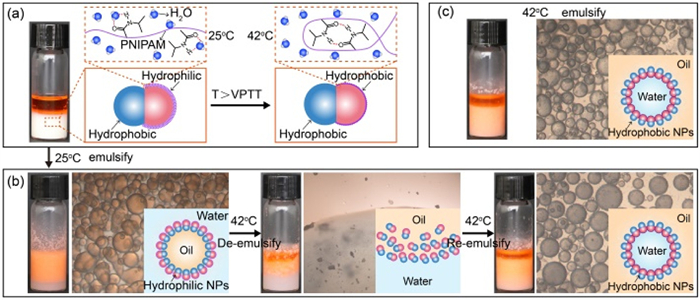 | Fig. 5. Emulsification and de-emulsification of emulsions stabilized by temperature-responsive PLA-PNIPAM/shellac dimer NPs. (a) Schematics showing the reversible change between amphiphilic and hydrophobic PLA-PNIPAM/shellac NPs upon heating and cooling. (b) Photographs and optical microscope images of NP-stabilized oil-in-water emulsions emulsified at 25 ℃ (left), de-emulsified at 42 ℃ by gentle shaking (middle) and re-emulsified into water-in-oil emulsifications at 42 ℃ by vortexing (right). (c) Photographs and optical microscope images of NP-stabilized water-in-oil emulsions directly emulsified at 42 ℃. | |