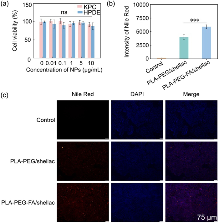 | Fig. 6. Biocompatibility and drug delivery performances of PLA-PEG/shellac and PLA-PEG-FA/shellac dimer NPs. (a) Co-culture of PLA-PEG/shellac dimer NPs with KPC and HPDE cells, showing good biocompatibility. (b) Mean fluorescent intensity of KPC cells after 24 h’ co-culture with PLA-PEG/shellac and PLA-PEG-FA/shellac dimer NPs measured by flow cytometry. (c) Fluorescent confocal microscope images of KPC cells after 24 h’ co-culture with PLA-PEG/shellac and PLA-PEG-FA/shellac dimer NPs. The concentrations of PLA-PEG/shellac and PLA-PEG-FA/shellac dimer NPs are the same of 5 µg/mL. The red signal represents NPs loaded with Nile Red, while the blue signal represents nuclei stained by DAPI. PLA-PEG/shellac dimer NPs are prepared using 10 mg/mL shellac and 10 mg/mL PLA with 2.5% PLA-PEG, while PLA-PEG-FA/shellac dimer NPs are prepared using 10 mg/mL shellac and 10 mg/mL PLA with 2.5% PLA-PEG-FA. ns, not significant. ***P < 0.001. Data are presented as mean ± standard deviation (SD) (n = 3). | |