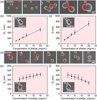 | Fig. 2. Amphiphilic PLA-PEG/shellac dimer NPs with tunable size and shape. (a) SEM images of dimer NPs prepared with a same concentration of shellac and PLA (Cshellac = CPLA), while the concentrations of shellac and PLA increase from 2.5 mg/mL to 20 mg/mL. (b) PLA bulb diameter (DP) and (c) dimer NP diameter (D) as a function of shellac concentration. Shellac and PLA have a same concentration. (d) SEM images of dimer NPs prepared with a same total concentration of Cshellac + CPLA = 20 mg/mL, while the concentration ratio of Cshellac:CPLA increases from 4:16 to 16:4. (e) Shellac bulb diameter, DS, and (f) PLA bulb diameter, DP, as a function of shellac concentration. The total concentration of Cshellac + CPLA is kept constant at 20 mg/mL. Data are presented as mean ± standard deviation (SD) (n = 60). | |
