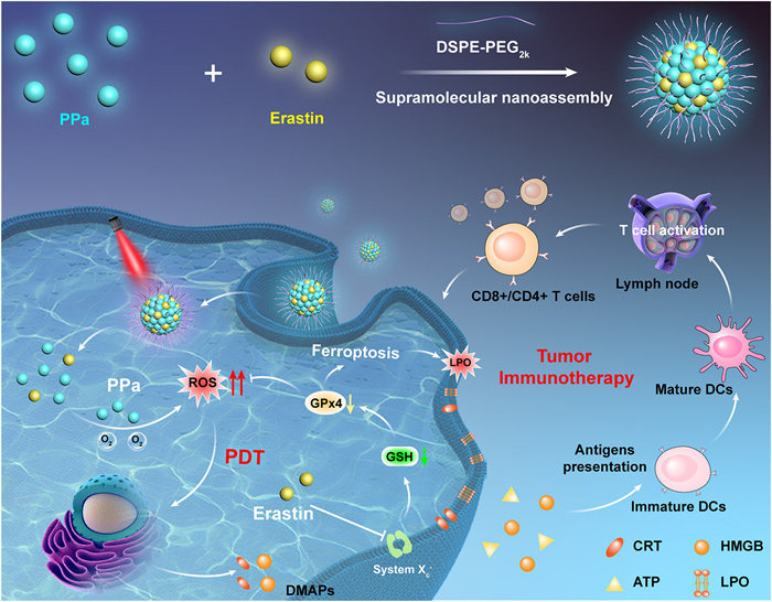 | Fig. 1. Schematic representation of spatiotemporally-controlled supramolecular hybrid nanoassemblies (PPa@Era NAs) enabling ferroptosis-augmented photodynamic immunotherapy of cancer. | |
