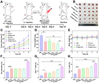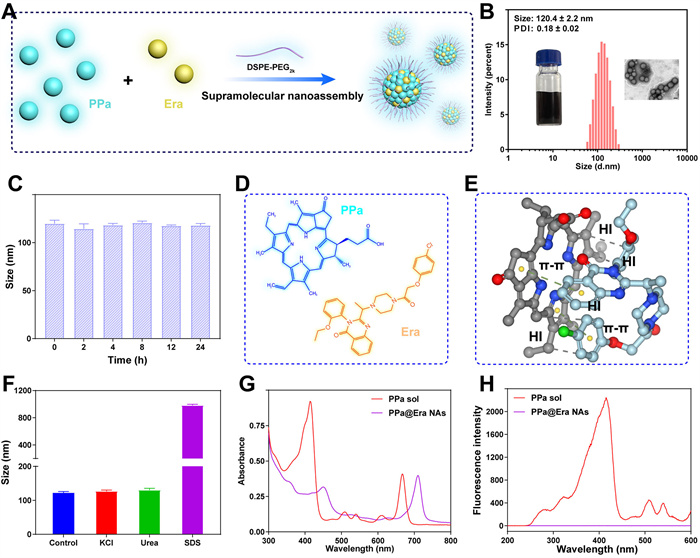 | Fig. 2. The characterization of PPa@Era NAs. (A) Schematic representation of the nanoassembly process of PPa@Era NAs. (B) Appearance photos, TEM images and particle size distribution profiles of PPa@Era NAs. Scale bar: 100 µm. (C) The colloidal stability of PPa@Era NAs after incubation in PBS containing 10% FBS for 24 h at 37 ℃. (D) The chemical structure of PPa and Era. (E) Molecular docking simulation depicting the intermolecular interactions between PPa and Era. π-π: π-π stacking interaction. HI: hydrophobic interaction. (F) Diameter changes of PPa@Era NAs in the presence of KCl, urea and SDS, respectively. (G) UV absorption spectra of PPa solution (sol) and PPa@Era NAs. (H) Fluorescence spectra of PPa sol and PPa@Era NAs spanning from 250 nm to 600 nm. Data are presented as mean ± standard deviation (SD) (n = 3). | |