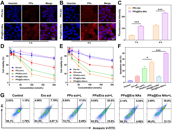 The excellent assembly capability and colloidal stability of PPa@Era NAs motivated further exploration of their therapeutic advantages at the cellular level. Firstly, the cellular uptake of hybrid nanoassemblies was observed through confocal microscopy and quantitatively determined via flow cytometry. As shown in Figs. 3A–C, PPa sol and PPa@Era NAs were internalized into tumor cells in a time-dependent manner. Remarkably, PPa@Era NAs demonstrated significantly higher cellular uptake efficiency than PPa sol under identical conditions. This difference may arise from the distinct uptake mechanisms of free drugs and nanomedicines. Most free drug molecules enter cells through a concentration-dependent passive diffusion, whereas nanomedicines can be efficiently internalized through concentration-independent endocytosis pathways [23-26]. Enhanced cellular uptake undoubtedly augments photodynamic cytotoxicity. Next, we investigated the cellular ROS generation ability of hybrid nanoassemblies in 4T1 cells. As depicted in Fig. S4 (Supporting information), cells treated with PPa@Era NAs exhibited much stronger fluorescence signals under laser irradiation compared to PPa sol, suggesting the excellent cellular ROS generation ability of nanoassemblies under laser irradiation, likely attributed to efficient cellular uptake. The favorable cellular uptake and ROS generation of hybrid nanoassemblies prompted a deeper exploration of synergistic cytotoxicity. As shown in Fig. 3D and Table S4 (Supporting information), the PPa@Era NAs + Laser group demonstrated the highest cytotoxicity against 4T1 cells compared to the other groups, indicating significant advantages in the synergistic and synchronous delivery of PPa and Era. Furthermore, the observed synergistic cytotoxicity was also demonstrated in CT26 cells (Fig. 3E). Subsequently, cellular apoptosis after treatment with different formulations was detected using flow cytometry with Alexa Fluor 488 Annexin V/propidium iodide (PI) dual staining kits. Consistent with the cytotoxicity results, a substantial proportion of cell apoptosis (> 50%) was observed upon exposure to PPa@Era NAs under laser irradiation (Figs. 3F and G).