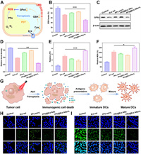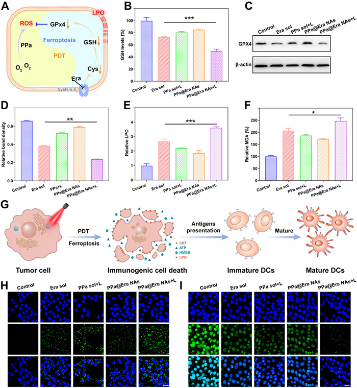 | Fig. 4. Synergistic mechanism of inducing ferroptosis and ICD. (A) Schematic illustration of the synergistic enhancement of intracellular oxidative stress by PPa and Era. (B) Intracellular GSH levels in 4T1 cells after treatments. (C, D) WB analysis results of intracellular GPX4 in 4T1 cells after treatments. (E) LPOs levels in 4T1 cells after treatments. (F) MDA levels in 4T1 cells after treatments. (G) Schematic illustration of inducing ICD. (H) Confocal laser scanning microscope (CLSM) images of CRT exposure in 4T1 cells. (I) CLSM images of HMGB1 release in 4T1 cells. Scale bar: 100 µm. *P < 0.05, **P < 0.05, ***P < 0.001. Data are presented as mean ± SD (n = 3). | |