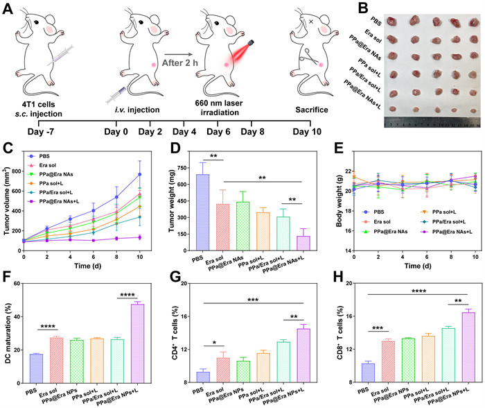 It has been established that LPOs instigated by ferroptosis function as a "find me" signal. Concurrently, DMAPs serve as an "eat me" signal. Together, these signals collectively contribute to the maturation of DCs, augmenting the infiltration of cytotoxic T lymphocytes and fostering a robust immune response. Consequently, we proceeded to investigate the induction of DCs maturation in vivo. As illustrated in Fig. 5F and Fig. S13, PPa@Era NAs exhibited a significant advantage over other formulations. Impressively, PPa@Era NAs induced approximately a 2.7-fold increase in DCs maturation under laser irradiation compared to the phosphate buffer solution (PBS) control. Matured DCs play a crucial role in presenting antigens to naive T lymphocytes, thereby promoting T cell proliferation. To evaluate the potency and contribution of immune-mediated antitumor activity, the infiltration of immune cells (CD8+ T cells and CD4+ T cells) into the tumors was assessed, as an increase in CD8+ T and CD4+ T cell population signifies a robust immune response. As depicted in Figs. 5G and H and Figs. S14 and S15 (Supporting information), the tumor infiltration of both CD8+ T cells and CD4+ T cells experienced a substantial increase after treatment with PPa@Era NAs under laser irradiation compared to other formulations. Furthermore, the levels of several pivotal cytokines were analyzed using ELISA kits. As shown in Figs. S16 and S17 (Supporting information), PPa@Era NAs induced an up-regulation of tumor necrosis factor alpha (TNF-α) and interferon gamma (IFN-γ) under laser irradiation. Taken together, these results suggested that PPa@Era NAs triggered a powerful anti-tumor immune response.