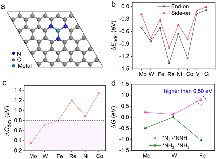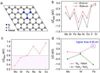 | Fig. 1. (a) Structures of single metal atoms supported on N-graphene. (b) Adsorption energy of N2 with end-on and side-on modes on various metal atoms. (c) Desorption free energy (∆Gdes) of NH3 on various SACs. (d) The free energy barriers (∆G) for the hydrogenation of *N2 to *NNH and the hydrogenation of *NH2 to *NH3. | |