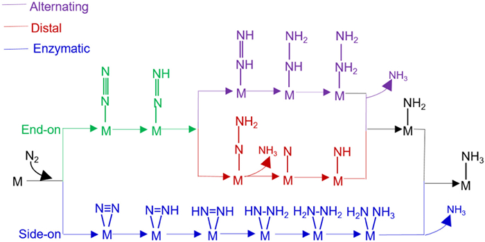 | Fig. 2. Schematic depiction of three mechanisms for N2 electroreduction to NH3 on M1/N-graphene. | |
