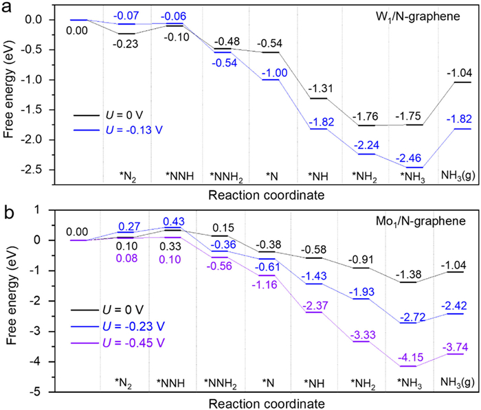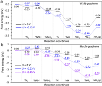 | Fig. 3. Gibbs free energy diagrams for electrochemical NRR on (a) W1/N-graphene and (b) Mo1/N-graphene along the distal pathways. The temperature used for calculating Gibbs free energy was 298.15 K. | |