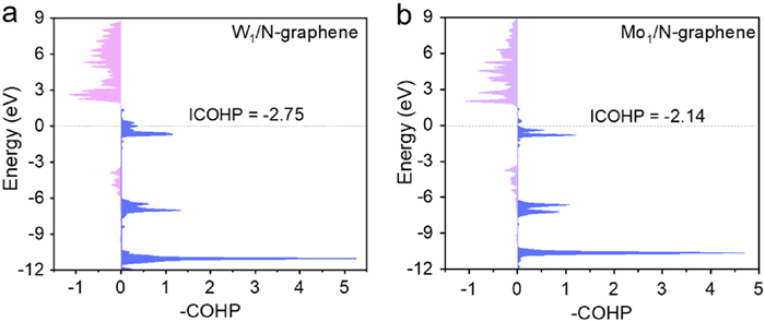 | Fig. 4. The crystal orbital Hamilton population between adsorbed N2 and the active sites on (a) W1/N-graphene and (b) Mo1/N-graphene. | |