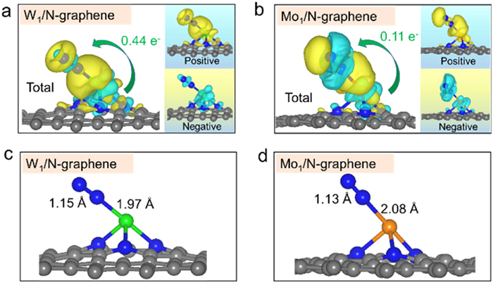 | Fig. 5. Difference charge density diagrams of adsorbed N2 on (a) W1/N-graphene and (b) Mo1/N-graphene. The optimal structures of the adsorbed N2 on (c) W1/N-graphene and (d) Mo1/N-graphene. | |