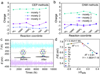 | Fig. 6. Charge variation of the graphene (moiety 1), W1-N3 (moiety 2), NxHy species (moiety 3) on W1/N-graphene at different species states along the minimum Gibbs free energy surface, calculated by (a) constant-potential DFT and (b) CNM methods. (c) Ab initio molecular dynamics simulations of W1/N-graphene with variations in temperature (T) and energy (E) at 500 K, with a time-step of 1 fs. The inserts show top and side views of the atomic configuration snapshot before and after the ab initio molecular dynamics simulation. (d) The relationship between the first ionization energy (FIE) of metals and the adsorption free energy (∆Gads) of N2. | |