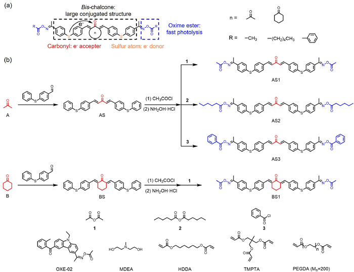 Chemical structure invariably exerts a significant influence on compound performance. Therefore, it is prudent to balance the photoinitiating abilities and light-absorption properties by introducing chemical moieties properly for PIs' molecule design. Chalcones, the cornerstone of numerous biologically intriguing compounds sourced from nature, have garnered substantial research attention over decades [16,25]. Due to their brilliant light-absorption properties and photosensitivity, chalcones have been used in photocuring either as Type Ⅱ PIs or photosensitizers [26-33]. Recently, Chen et al. have successfully introduced triphenylamine into four chalcone structures as one-component Type Ⅱ PIs, improving the absorption in visible-light region obviously [26,27]. Meanwhile, chalcone has favorable energy interaction with iodonium salt (Iod) [28], leading to the development of three-component photoinitiating systems comprising chalcone, Iod, and co-initiator [29-31,34]. These systems demonstrate impressive light-absorption properties and photoinitiating abilities in both radical and cationic photopolymerizations. However, the extensive usage of iodonium salt has greatly increased the cost. In addition, researchers have improved the photoinitiating performance of chalcones by incorporating the oxime ester (OXE) moiety [35-37], which triggers the formation of highly active free radicals through the photolysis of the N—O bond [22,38-41]. Tang et al. introduced the OXE moiety into cyclopentanone-based chalcone successfully, resulting in PIs with outstanding light-absorption property and photobleaching ability [35]. Nevertheless, the ring structure of cyclopentanone exhibited negative influences on the formation of conjugated system and electron transfer, thereby diminishing the photoinitiating rate [42]. Hence, it is imperative to fully exploit the advantages of both the chalcone moiety and the OXE moiety through meticulous molecular design, achieving high photoinitiating performance and excellent light-absorption properties simultaneously.