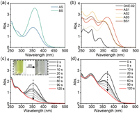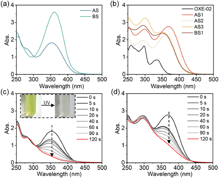 | Fig. 3. UV–vis absorption spectra of (a) bis-chalcones and (b) OXEs. Steady-state photolysis curve of (c) AS and (d) AS1. All tests were conducted in ethyl acetate with PI's concentration of 1 × 10–4 mol/L under 365 nm LED, and the light intensity is 100 mW/cm2. | |