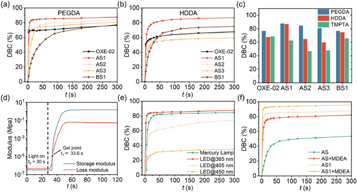 | Fig. 6. Curves of (a) PEGDA and (b) HDDA polymerization initiated by four OXEs and OXE-02 under exposure to LED@365 nm. (c) Photoinitiation performance comparison of four OXEs in PEGDA, HDDA and TMPTA under LED@365 nm for 300 s. (d) Photorheological test of PEGDA with AS1. The intersection of the loss modulus and storage modulus curves is the gel point, and tgel (s) = t1 (s) −30. (e) AS1 in PEGDA under different light sources (Light intensity IMercury = I365 = I405 = I450 = 100 mW/cm2). (f) AS/AS1 with co-initiator MDEA in PEGDA under LED@365 nm. For all experiments above, the concentration of MDEA and PIs are 1.5 × 10−5 mol/g, and DBC represents the double bond conversion rate. | |