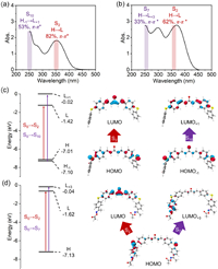 | Fig. 4. UV–vis absorption spectra of (a) AS and (b) AS1, with the absorption peaks marked along with their corresponding transitions. Frontier molecular orbital diagrams with several main transitions of (c) AS and (d) AS1. The acronyms of HOMO and LUMO stand for highest occupied molecular orbital and lowest unoccupied molecular orbital, respectively. | |