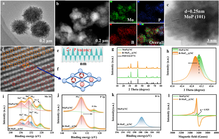 | Fig. 1. (a) TEM image, (b) STEM image and the corresponding element mapping images, and (c) HRTEM image of B-MoP1-x@NC sample. (d) STEM-HADDF image and the corresponding P vacancy evidences of B-MoP1-x@NC sample. (e) The intensity of Mo and P atomic columns along red dotted line in (d). (f) The theoretical model of MoP. (g) XRD patterns of MoP@NC and B-MoP1-x@NC samples. (h) Magnified image of (101) diffraction peaks of MoP@NC and B-MoP1-x@NC samples; High-resolution of (i) Mo 3d, (j) P 2p and (k) B 1s spectra of MoP@NC and B-MoP1-x@NC samples. (l) EPR signals of MoP@NC and B-MoP1-x@NC samples. | |