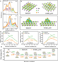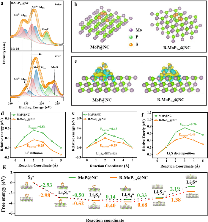 | Fig. 2. (a) High-resolution Mo 3d spectra of the pristine B-MoP1-x@NC catalyst and the composite of B-MoP1-x@NC-Li2S6 sample. (b) LiPSs adsorption models on the surface of MoP@NC and B-MoP1-x@NC catalysts. (c) Differential charge distributions of Li2S6 adsorbed on the (101) crystal plane of MoP@NC and B-MoP1-x@NC (yellow regions: electron accumulation; cyan regions: electron depletion). (d) Li+ ions diffusion energy barriers, (e) Li2S6 cluster migration energy barriers, and (f) Li2S cluster decomposition energy barriers on the (101) crystal plane of MoP@NC and B-MoP1-x@NC catalysts. (g) The calculated Gibbs free energy for the conversion reactions of LiPSs driven by MoP@NC and B-MoP1-x@NC catalysts. | |