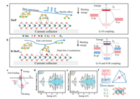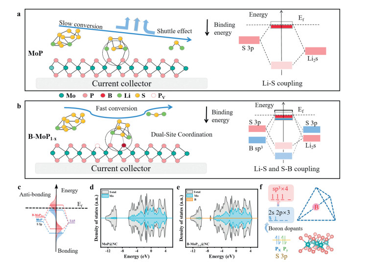 | Fig. 3. Schematic illustration the differences in action mechanism between (a) MoP and (b) B-MoP1-x catalysts on the conversion reaction kinetics of LiPSs. (c) The influences of band engineering on the P-band elevation and s-p hybridization. Density of states (DOS) of (d) MoP@NC and (e) B-MoP1-x@NC. (f) The alignment of atomic surface orbitals with LiPSs and the orientation of S-coupling modified by the introduction of boron dopants. | |