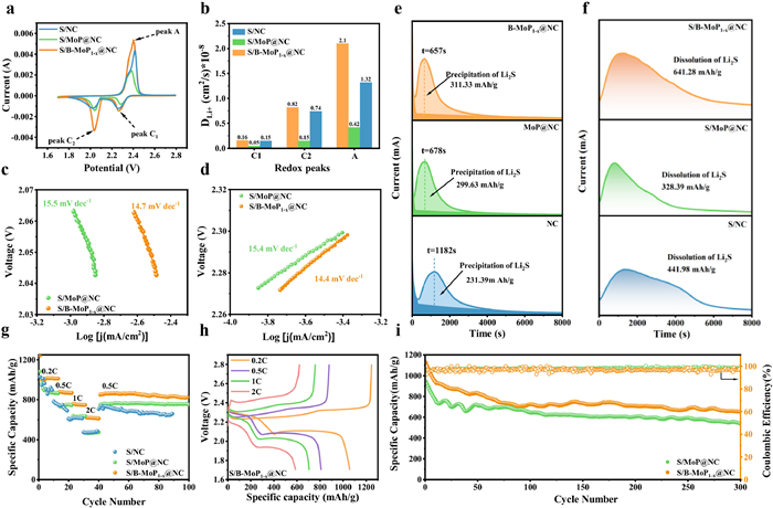 | Fig. 4. (a) CV curves of S/B-MoP1-x@NC, S/MoP@NC and S/NC cathodes at 0.1 mV/s. (b) The calculated diffusion coefficients of Li+ ions corresponding to redox peaks A, C1 and C2. Tafel slopes calculated based on the (c) oxidation peaks and (d) reduction peaks in CV curves of S/B-MoP1-x@NC and S/MoP@NC cathodes. (e) Li2S nucleation/growth/precipitation behavior and (f) Li2S dissolution behavior of B-MoP1-x@NC/MoP@NC/NC electrodes. (g) Rate performances of S/B-MoP1-x@NC, S/MoP@NC and S/NC cathodes (0.2–2 C). (h) Galvanostatic charge/discharge curves corresponding to the rate performance of S/B-MoP1-x@NC cathode. (i) Comparisons of cyclic stability of S/B-MoP1-x@NC and S/MoP@NC cathodes at 0.5 C. | |