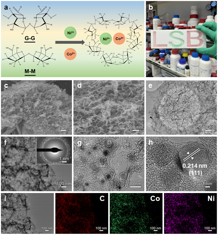 | Fig. 1. (a) Schematic diagram of the synthesis of SA/NiCo. (b) Hydrogels of different shapes. (c, d) SEM, (e-h) TEM and (i) EDS images of SAC/NiCo. | |