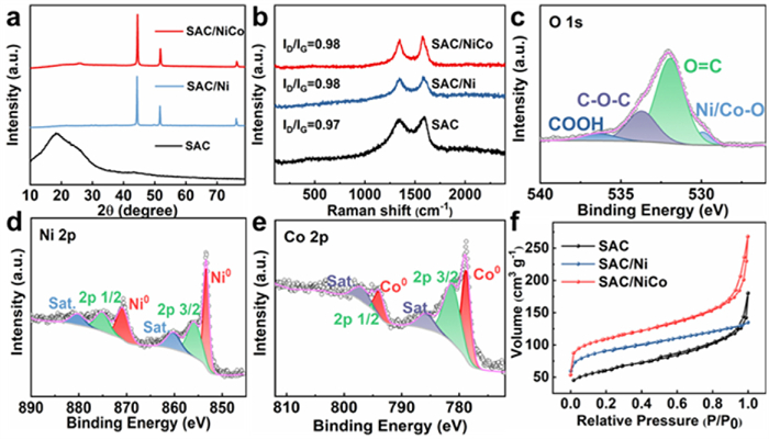 | Fig. 2. (a) XRD and (b) Raman of SAC, SAC/Ni and SAC/NiCo. XPS spectrum of (c) O 1s, (d) Ni 2p and (e) Co 2p signals for SAC/NiCo. (f) BET results of SAC, SAC/Ni and SAC/NiCo. | |