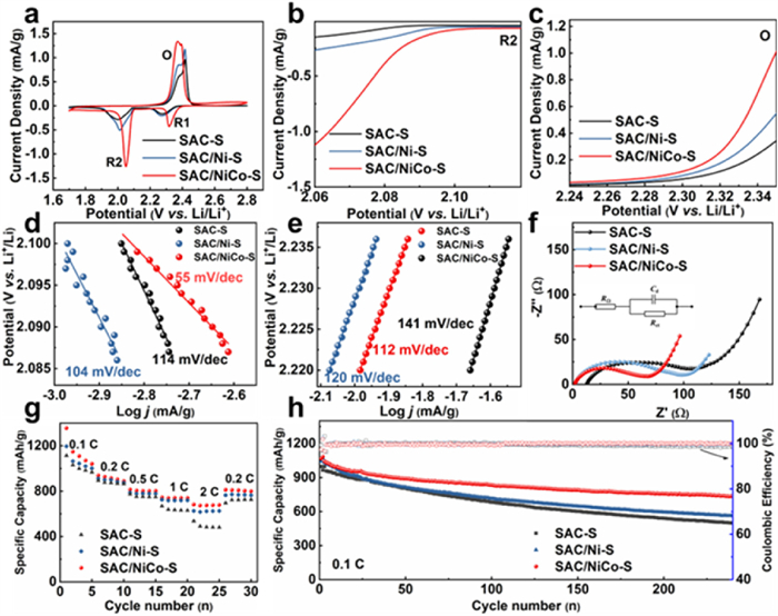 To illustrate the superior electrochemical performance of SAC/NiCo-S cathode, cyclic voltammetry (CV) curves at 0.1 mV/s of SAC-S, SAC/Ni-S and SAC/NiCo-S cathodes were tested in LSBs. As shown in Fig. 4a, there are two pairs of redox peaks, which are indicative of the reversible reduction and oxidation processes involving the transformation of sulfur to long-chain soluble lithium polysulfides (Li2Sx, 4 ≤ x ≤ 8, R1/O1) and the conversion of short-chain solid lithium sulfides (Li2S2/Li2S, R2/O2). SAC/NiCo-S cathode shows the sharpest redox peaks and the lowest voltage polarization, indicating the excellent electrochemical redox reactivity. Furthermore, the accelerated electrochemical kinetic of SAC/NiCo-S cathode was convinced by the earliest onset potential of oxidation peak and the latest onset potential of reduction peak (Figs. 4b and c).
