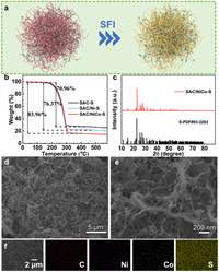 | Fig. 3. (a) Schematic fabrication process of SAC/NiCo-S. (b) TG results. (c) XRD, (d, e) SEM and (f) EDS results of SAC/NiCo-S. | |