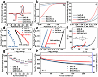 | Fig. 4. (a) CV curves of SAC-S, SAC/Ni-S and SAC/NiCo-S. LSV curves from the (b) R2 reduction peak and (c) oxidation peak in CV curves. The derived Tafel plots from (d) R2 reduction peak and (e) O oxidation peak in CV curves. (f) Nyquist plots (and equivalent circuit diagram in inset). (g) Rate performance and (h) cycling performance of SAC-S, SAC/Ni-S and SAC/NiCo-S. | |