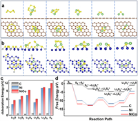 | Fig. 5. The polysulfides immobilization kinetics and catalytic conversion procedure on (a) C and (b) NiCo. (c) The adsorption energy plots on C, Ni and NiCo surface. (d) The free energy plots of Li2Sx/S8 conversion reactions. | |