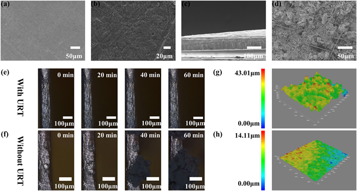 | Fig. 3. SEM image of Zn surface cycled at 5 mA/cm2 for 25 cycles in URT/ZnSO4 electrolyte (a) at 50 µm standard, (b) at 20 µm standard, (c) cross-section of image. (d) SEM image of Zn surface cycled at 5 mA/cm2 for 25 cycles in ZnSO4 electrolyte. Optical microscope image of zinc deposition at 5 mA/cm2 in (e) URT/ZnSO4 electrolyte and (f) ZnSO4 electrolyte. Ultra-depth three-dimensional microscopy image of Zn surface (g) cycled in ZnSO4 electrolyte and (h) cycled in URT/ZnSO4 electrolyte. | |